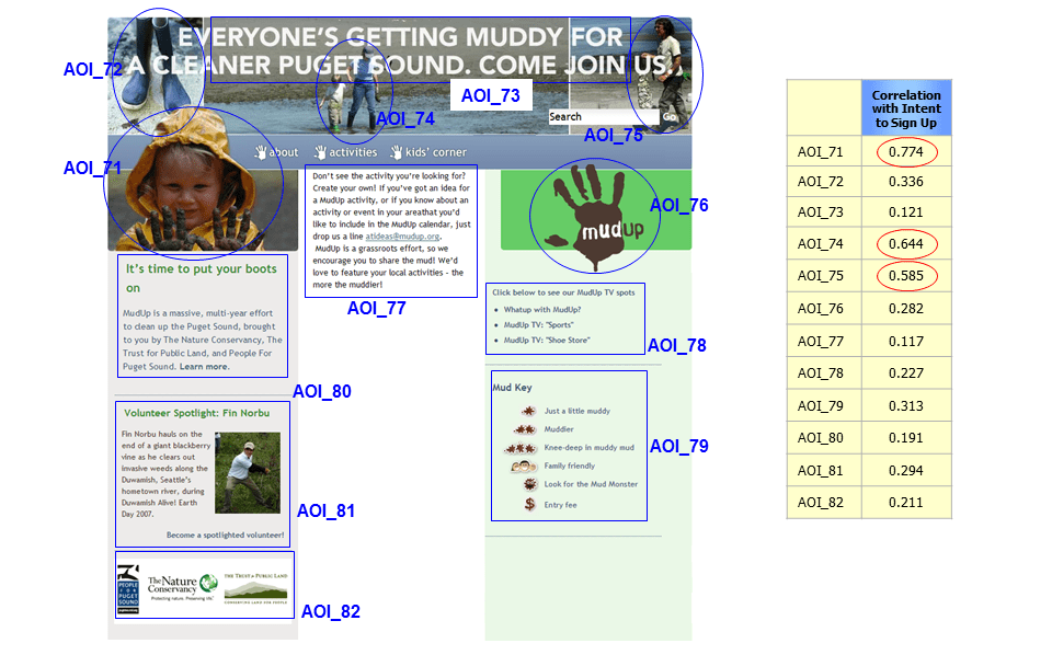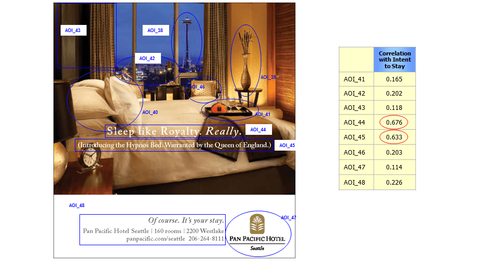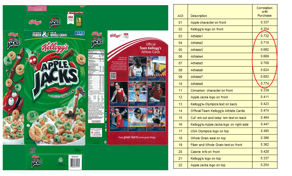 This same principle can be applied at an even deeper level. For example, if you wished to learn whether the addition of certain athletes to a cereal package had any measurable effect on sales, you could determine whether positive brain states occurring while respondents are focused on the AOI’s relating to those athletes are correlated with sales. This is unique in the industry.